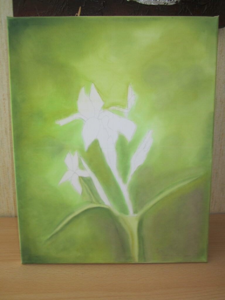 Voici le début d’un tableau, au Pastel Gras, avec un motif d’une fleur appelée Iris.