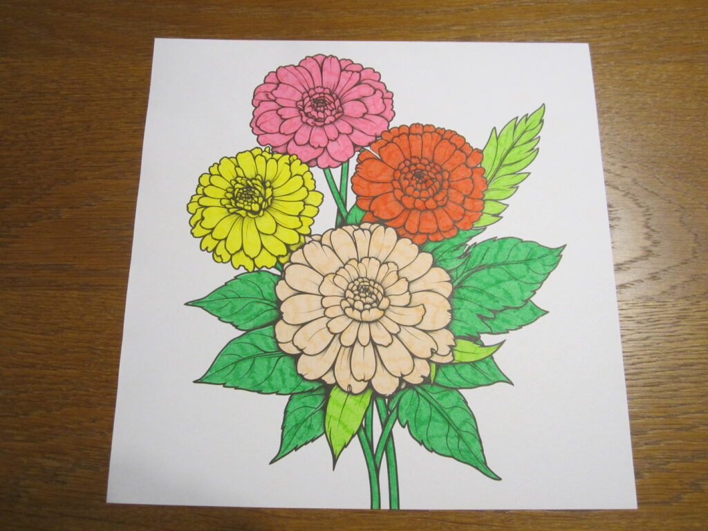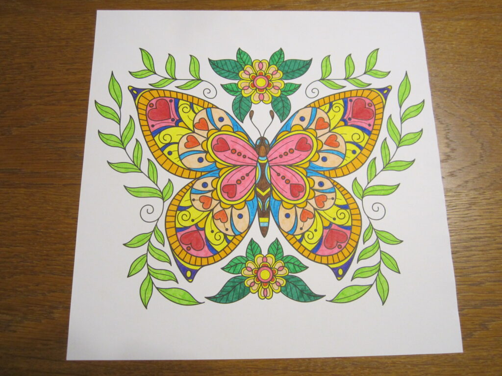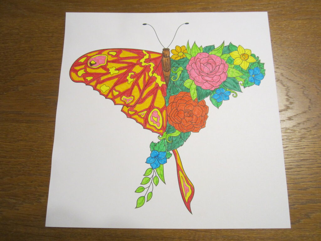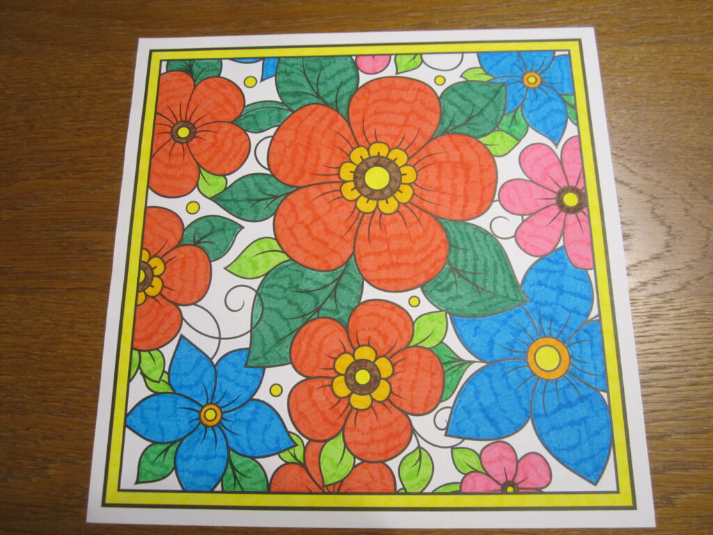 Coloriage Dessins avec des Couleurs Vives 1 avril 2026 / Voici quatre nouveaux dessins avec des couleurs vives, coloriés avec des feutres par mes soins: Dessin 1 – Bouquet des Fleurs Dessin 2 – Fleurs avec Encadrement Dessin 3 – Papillon I Dessin 4 – Papillon II