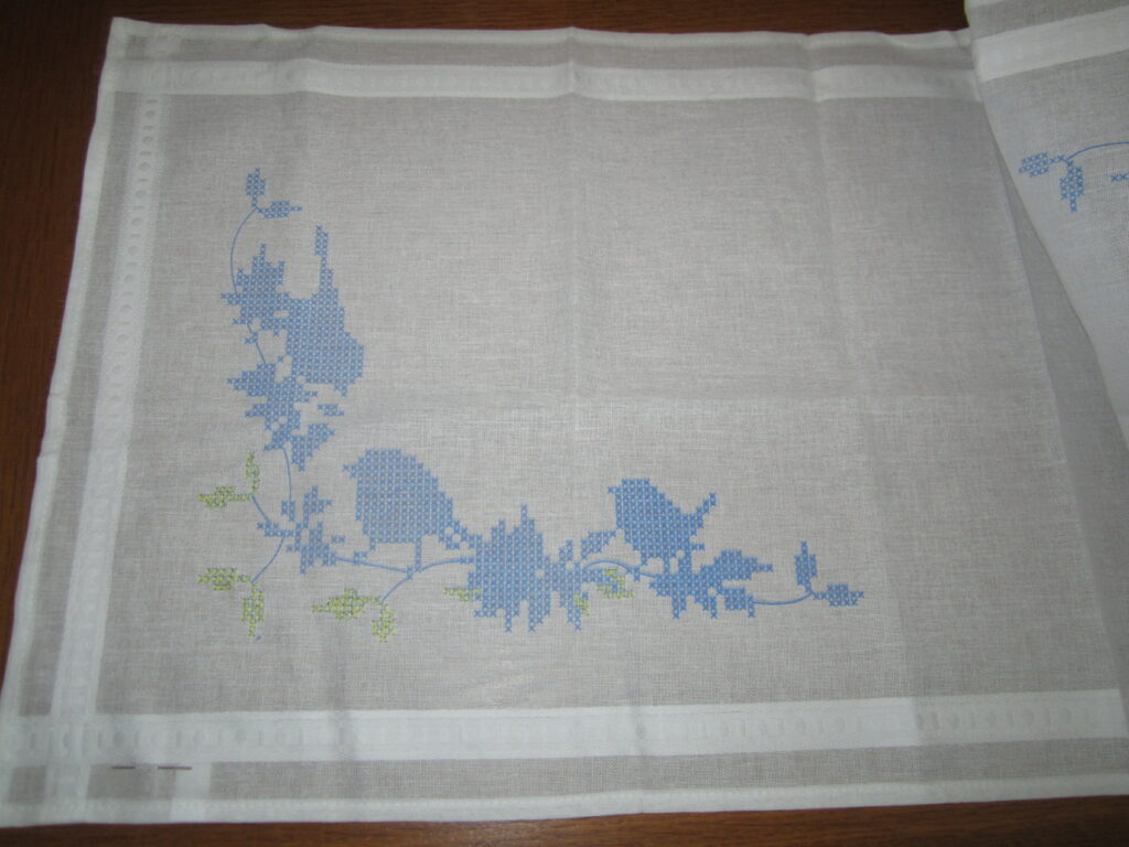 Je vous présente un nouvel ouvrage à faire en point de croix: une nappe blanche avec un motif printanier. C’est un motif imprimé sur celle-ci, avec des oiseaux et fleurs à mettre sur une table au Printemps. J’ai déjà commencé à broder la nappe par les feuilles avec un vert clair: