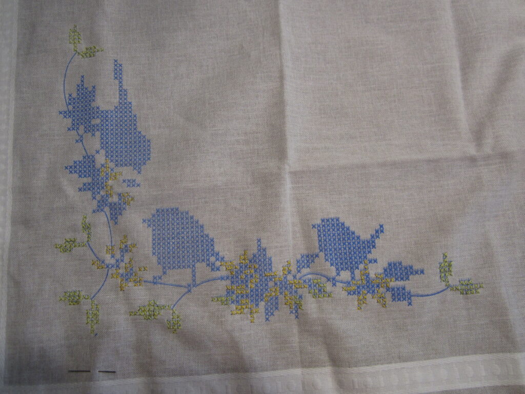 Point de Croix Nappe en Point de Croix 13 avril 2026 / PHASE 2 La nappe en point de croix est un peu plus avancée avec deux couleurs claires: le jaune et le vert: