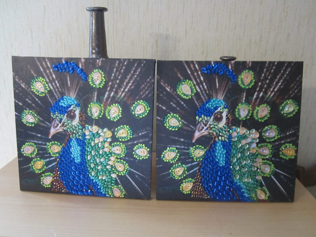 Me voici de nouveau pour vous présenter deux nouveaux travaux, avec la technique en Peinture Diamants, en représentant deux paons. Je les réalisés en deux jours seulement.