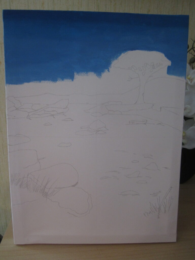 Voici un nouveau tableau que j’ai commencé aujourd’hui. C’est un ouvrage avec un joli motif d’un paysage, avec le nom « Calanque en Esterel ». J’irai peindre le tableau avec la technique de gouache. Le voici déjà avec des traces de crayon du dessin et, aussi, déjà avec un peu de peinture: