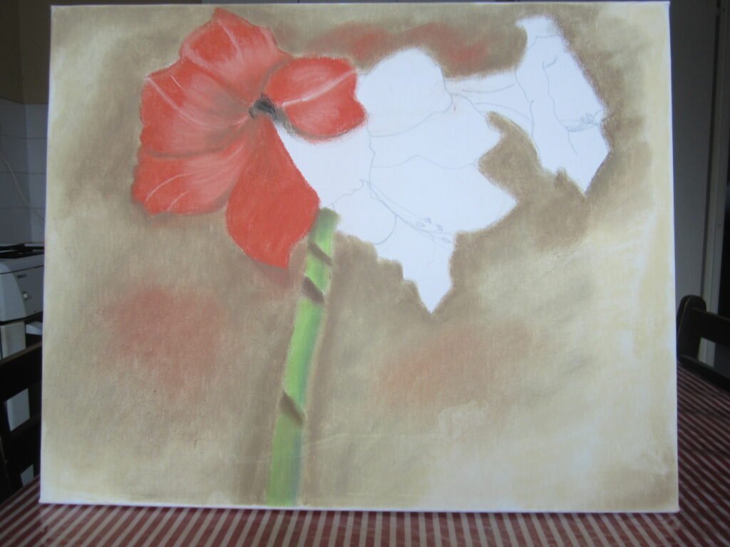 Salut à tous! Je vous présente un nouveau tableau avec un autre technique: le Pastel Sec. Dans ce tableau, il y a un motif que représente trois fleurs avec une tige appelées Amaryllis Rouge. Voici la photo du tableau au dessous: